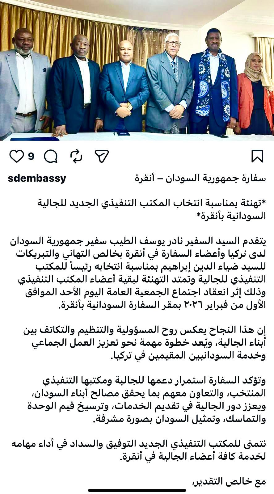 انعقدت الجمعية العمومية للجالية السودانية بانقرا وتم انتخاب المكتب التنفيذي للجالية برئاسة الكابتن ضياء الدين ابراهيم، واكتمل المكتب التنفيذي على النحو التالي: