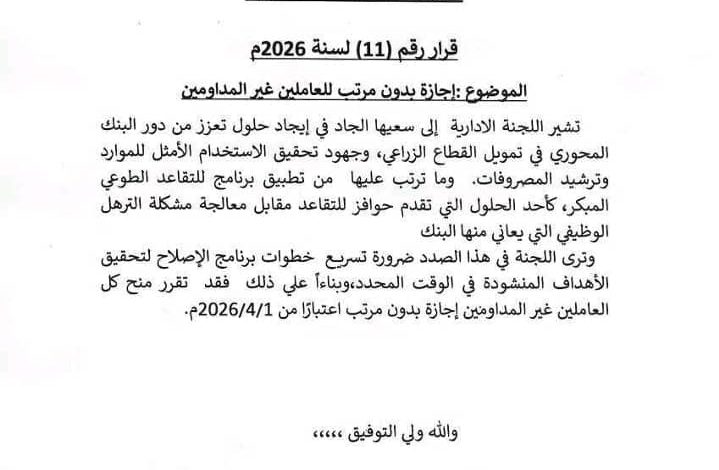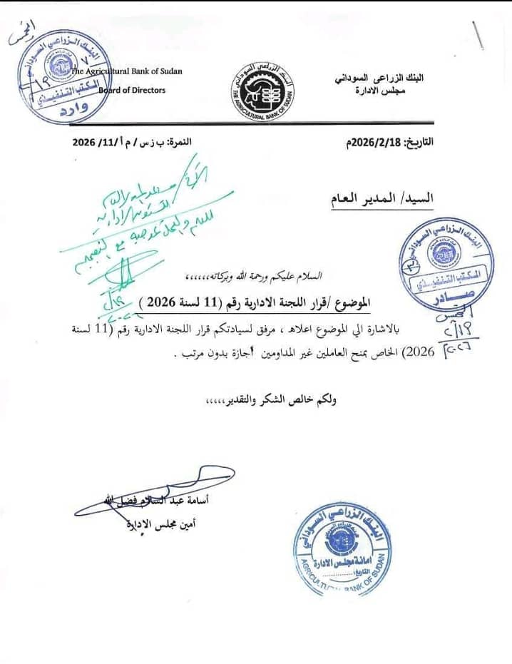 أصدر البنك الزراعي السوداني قراراً بمنح إجازات بدون مرتب للعاملين غير المداومين، وذلك اعتباراً من الأول من أبريل 2026. جاء هذا القرار في إطار جهود البنك لتطبيق برنامج إصلاحي يهدف إلى تعزيز دوره في تمويل القطاع الزراعي وتحقيق الاستخدام الأمثل للموارد وترشيد النفقات.