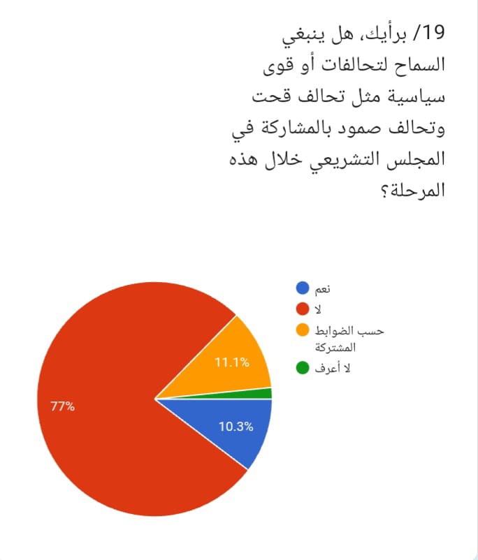 18/ وعند سؤال المشاركين: هل ينبغي السماح لتحالفات او قوى سياسية مثل تحالف قحت وتحالف صمود بالمشاركة في المجلس التشريعي خلال هذه المرحلة، اجاب %10.3 بنعم، بينما قال %77 لا، في حين رأى %11.1 ان المشاركة يمكن ان تتم حسب الضوابط المشتركة، بينما قال نحو %1.6 لا اعرف. وتشير هذه النتيجة الى رفض واسع لمشاركة هذه التحالفات في المجلس خلال المرحلة الحالية.