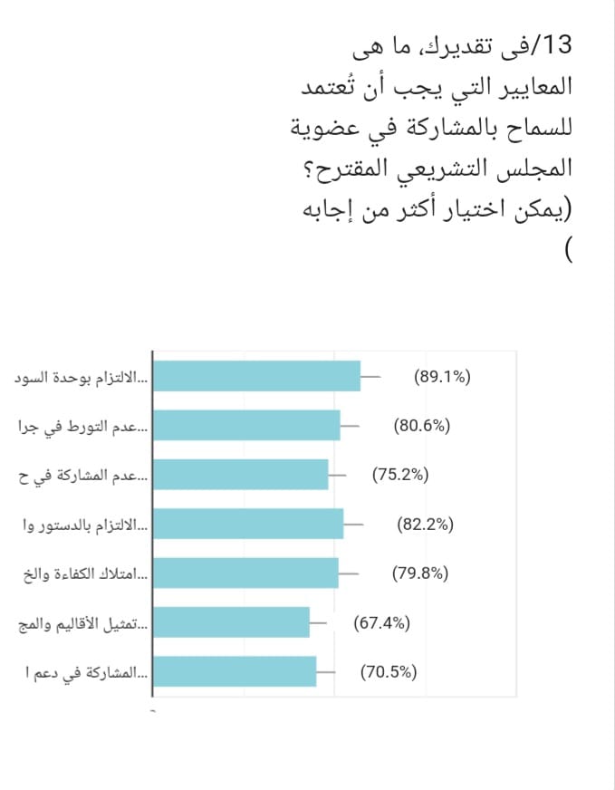 12/ وعند سؤال المشاركين: ما هي المعايير التي يجب ان تعتمد للسماح بالمشاركة في عضوية المجلس التشريعي المقترح ومنح المشاركين خيار انتخاب اكثر من اجابة، جاءت النتائج على النحو الاتي: