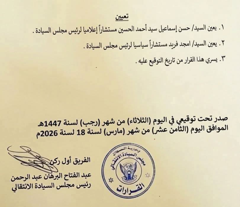 كما نص القرار على تعيين امجد فريد مستشاراً سياسياً لرئيس مجلس السيادة، في خطوة تشير إلى إعادة ترتيب دوائر المشورة السياسية والإعلامية في المرحلة الراهنة.