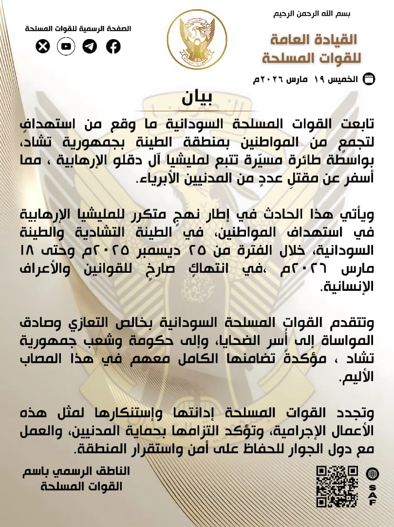 وقالت القوات المسلحة، في بيان صادر الخميس 19 مارس 2026، إنها تابعت الحادثة التي وصفتها بأنها تأتي ضمن نهج متكرر تتبعه قوات الدعم السريع في استهداف المدنيين في منطقتي الطينة السودانية والتشادية خلال الفترة من 25 ديسمبر 2025 وحتى 18 مارس 2026، معتبرة ذلك انتهاكًا صريحًا للقوانين والأعراف الإنسانية.