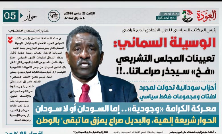 في هذه المساحة، نستنطق رئيس المكتب السياسي للحزب الاتحادي الديمقراطي، الوسيلة السماني، الذي يضع مبضع الجراح على جسد الأزمة السودانية الراهنة. بكلمات رصينة ورؤية ثاقبة، يفكك السماني تعقيدات المشهد السياسي، معلناً موقف الحزب الصارم من القضايا الجوهرية التي تشغل بال الشارع السوداني. من رفض التعيينات التشريعية “المبتسرة” إلى تحليل معركة الكرامة كخيار وجودي، يمضي الحوار ليرسم ملامح “العقد الاجتماعي” المفقود، داعياً إلى حوار وطني شامل ينهي عقوداً من التيه السياسي والإقصاء الممنهج، ويرسم خارطة طريق تعبر بالبلاد من ضيق الحرب إلى رحاب المؤسسية والمواطنة الحقة.