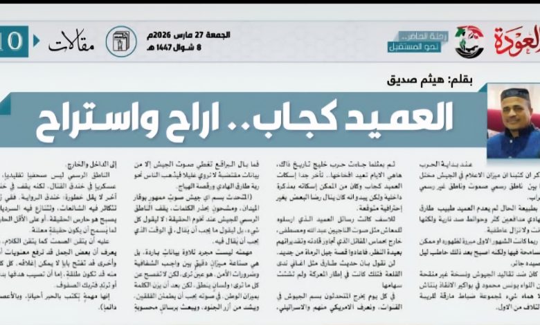 ثم بمثلما جاءت حرب خليج تاريخ ذاك، هاهي الايام تعيد افخاخها.. تأخر جدا إسكات العميد كجاب وكان من الممكن إسكاته بمذكرة داخلية ولكن يبدو انه كان ينال رضا البعض بغير إحترافية متوقعة.