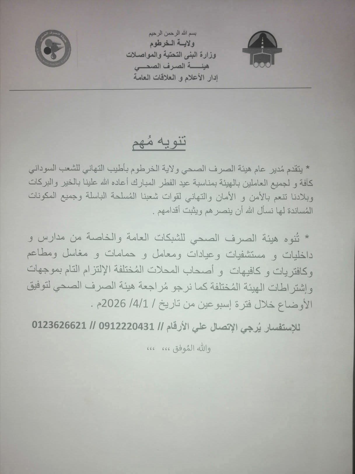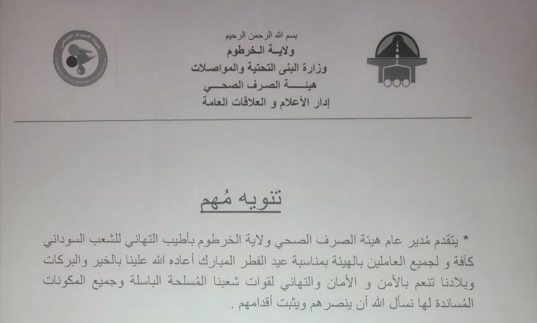 طالبت هيئة الصرف الصحي بولاية الخرطوم جميع المؤسسات التجارية والصحية بضرورة مراجعة الهيئة لتوفيق أوضاعها والالتزام بالضوابط والمعايير الخاصة بالصرف الصحي. وتشمل هذه المؤسسات: المدارس، والداخليات، والكافتيريات، والمستشفيات، والعيادات، والمعامل، والحمامات، والمغاسل، والمطاعم، والكافيهات، وأصحاب المحلات التجارية.
