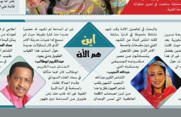 الفنان عبدالكريم ابوطالب كان نجما متألقا في سماء الغناء السوداني وقدم اعمالا ظلت راسخة في الذاكرة الفنية غير انه غاب منذ زمن طويل عن الساحة دون ظهور اعلامي او فني يذكر مما جعل جمهوره يتطلع لعودته من جديد ويستعيد حضوره الذي كان يمثل قيمة فنية معتبرة.