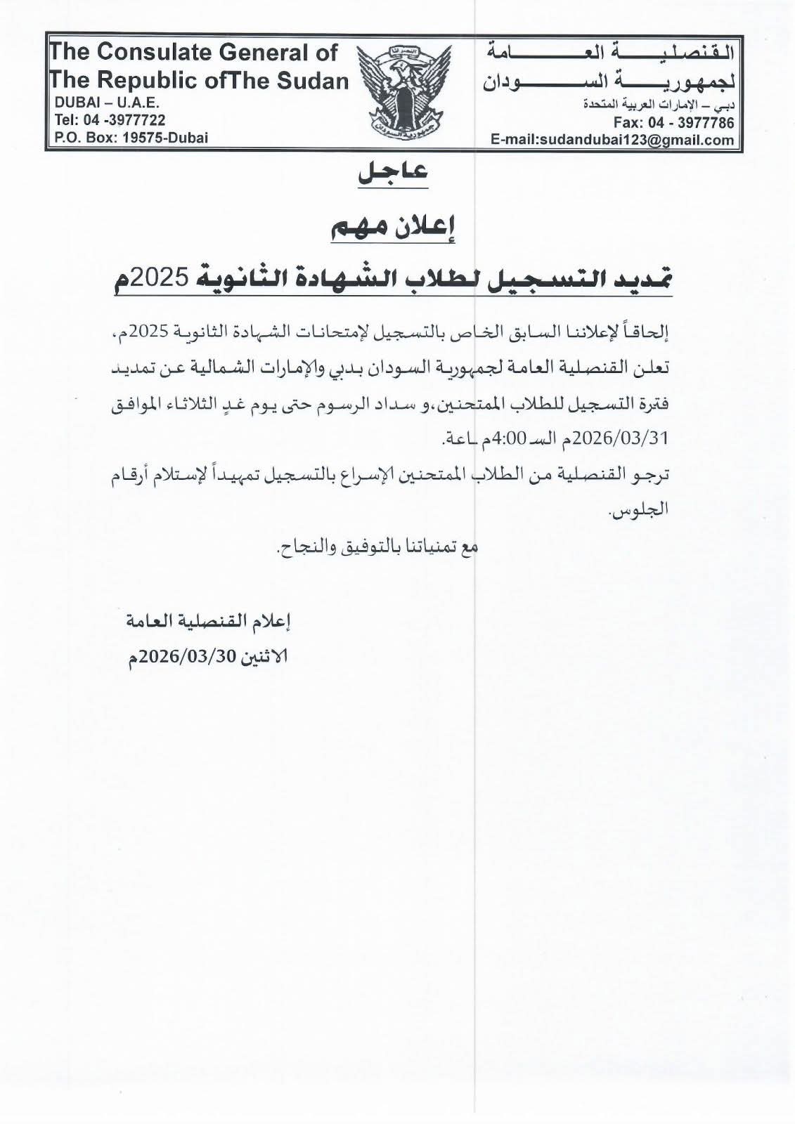 دبي– أعلنت القنصلية العامة لجمهورية السودان بدبي والإمارات الشمالية عن تمديد فترة التسجيل لطلاب الشهادة الثانوية دفعة 2025 الراغبين في أداء الامتحانات بمركز دبي، موضحة أن المهلة الجديدة تستمر حتى يوم الثلاثاء 31 مارس 2026 في تمام الساعة الرابعة عصراً، وتشدد القنصلية على ضرورة استكمال إجراءات التسجيل وسداد الرسوم الدراسية خلال هذه الفترة لضمان استلام أرقام الجلوس والحق في أداء الامتحانات، مؤكدة تمنياتها لجميع الطلاب السودانيين المقيمين في دولة الإمارات بدوام التوفيق والنجاح في مسيرتهم الأكاديمية.