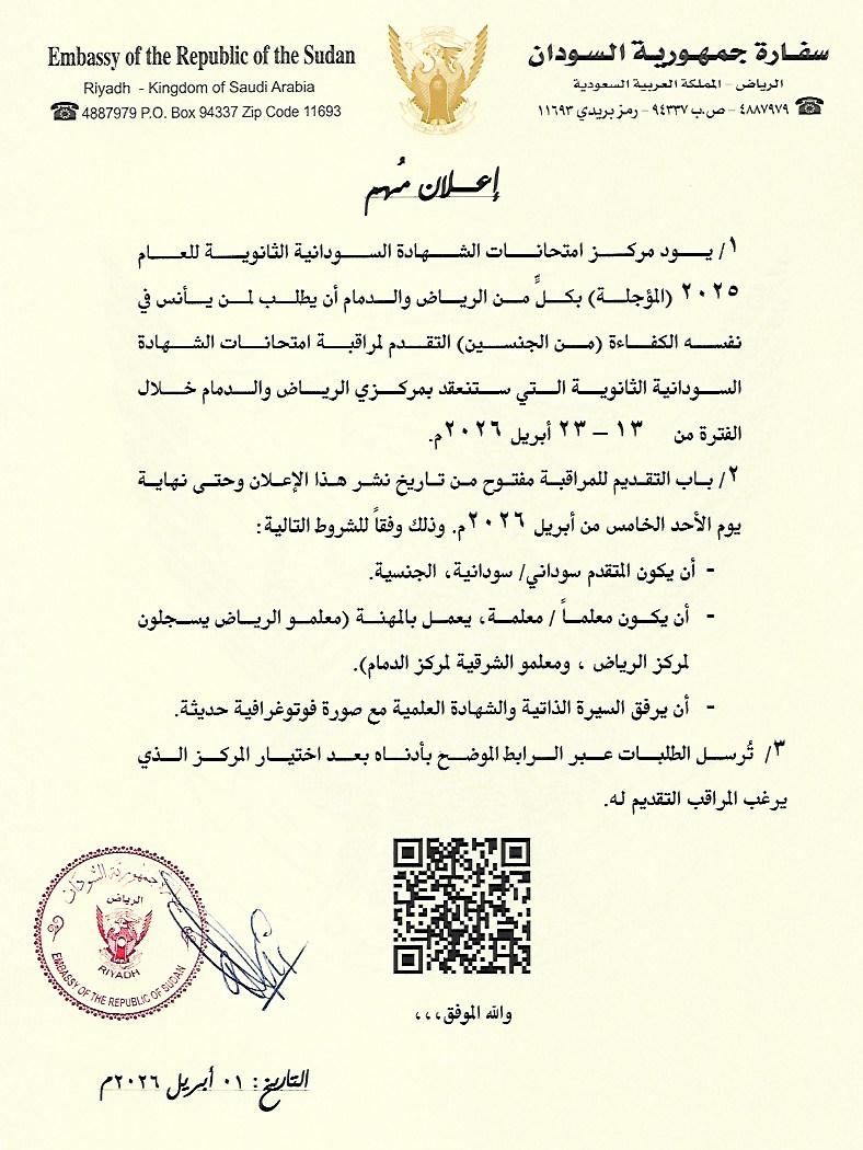 الرياض –أعلنت سفارة جمهورية السودان لدى المملكة العربية السعودية فتح باب التقديم للمعلمين والمعلمات الراغبين في العمل كمراقبين لامتحانات الشهادة الثانوية السودانية المؤجلة للعام 2025 والمقرر انعقادها في مركزي الرياض والدمام خلال الفترة من 13 إلى 23 أبريل 2026، وذلك في إطار الاستعدادات الجارية لتنظيم الامتحانات للطلاب السودانيين المقيمين بالمملكة.