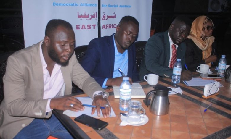عقد التحالف الديمقراطي للعدالة الاجتماعية – مكتب شرق أفريقيا اجتماعاً موسعاً بمشاركة عضو المكتب السياسي والناطق الرسمي حذيفة عبدالله ومسؤولة التدريب والتأهيل والتخطيط الاستراتيجي إيناس المصري ورئيس مكتب شرق أفريقيا نصر الدين أبوالريش إلى جانب قيادات المكتب وعدد من ممثلي اللاجئين السودانيين.