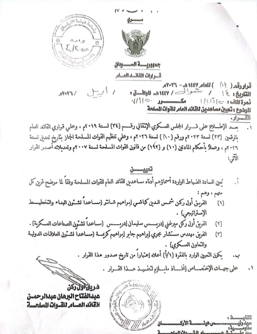 تأكيدا لما انفردت به العودة في الساعات الماضية فقد أصدر الفريق أول ركن عبد الفتاح البرهان القائد العام للقوات المسلحة قرارا بتعيين مساعدين له على النحو الذي نشرته العودة على النحو التالي: