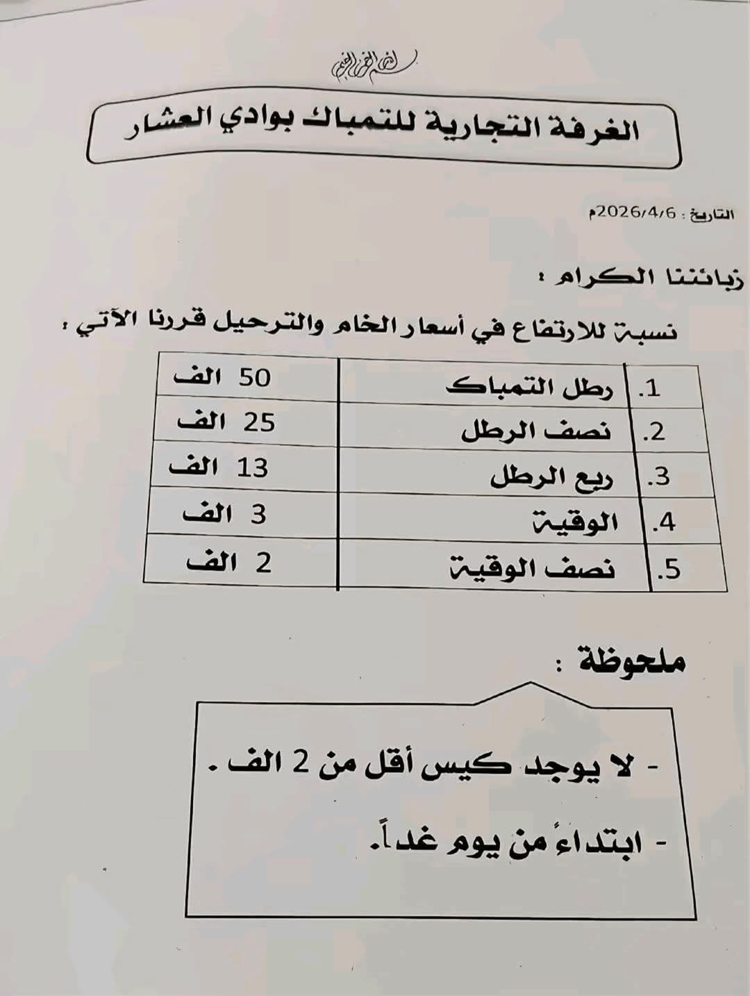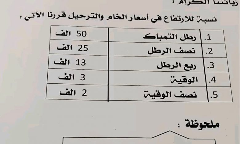 أعلنت الغرفة التجارية للتمباك بمنطقة وادي العشار عن زيادات جديدة في أسعار البيع للمستهلك.