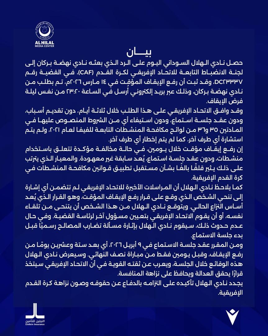 وقال الهلال في بيان رسمي : “حصل نادي الهلال السوداني، اليوم _أمس_، على الرد الذي بعثه نادي نهضة بركان إلى لجنة الانضباط التابعة للاتحاد الإفريقي لكرة القدم (CAF)، في القضية رقم (23337 DC)، وقد ثبت أن رفع الإيقاف المؤقت في 14 مارس 2026م تم بطلب من نادي نهضة بركان، وذلك عبر بريد إلكتروني أُرسل في الساعة 23:20 من نفس ليلة فرض الإيقاف وقد وافق الاتحاد الإفريقي على هذا الطلب خلال ثلاثة أيام، دون تقديم أسباب، ودون عقد جلسة استماع، ودون استيفاء أي من الشروط المنصوص عليها في المادتين 35 و36 من لوائح مكافحة المنشطات التابعة للفيفا لعام 2021، كما لم تتم استشارة أي طرف آخر ولم يتم إخطار أي طرف آخر” وأوضح: “إن رفع إيقاف مؤقت خلال يومين، في حالة مخالفة مؤكدة تتعلق باستخدام منشطات، ودون عقد جلسة استماع، يُعد سابقة غير معهودة، ويثير المعيار الذي يترتب على ذلك قلقاً بالغاً بشأن مستقبل تطبيق قوانين مكافحة المنشطات في كرة القدم الأفريقية ” .. وأكمل البيان : “كما يلاحظ نادي الهلال أن المراسلات الأخيرة للاتحاد الأفريقي لم تتضمن أي إشارة إلى تنحي الشخص الذي وقّع على قرار رفع الإيقاف المؤقت، وهو القرار الذي يُعد أساس النزاع الحالي، ويتوقع نادي الهلال من هذا الشخص أن يتنحى من تلقاء نفسه، أو أن يقوم الإتحاد الأفريقي بتعيين مسؤول آخر لرئاسة القضية، وفي حال عدم حدوث ذلك، سيقوم نادي الهلال بإثارة مسألة تضارب المصالح رسميًا قبل بدء جلسة الاستماع، ومن المقرر عقد جلسة الاستماع في 9 أبريل 2026، أي بعد ستة وعشرين يومًا من رفع الإيقاف، وقبل يومين فقط من مباراة نصف النهائي، وسيعرض نادي الهلال هذه الوقائع خلال الجلسة، ويعرب عن ثقته القوية في أن الاتحاد الأفريقي سيتخذ قراراً يحقق العدالة ويحافظ على نزاهة المنافسة، ويجدد نادي الهلال تأكيده على التزامه بالدفاع عن حقوقه وصون نزاهة كرة القدم الأفريقية” ..