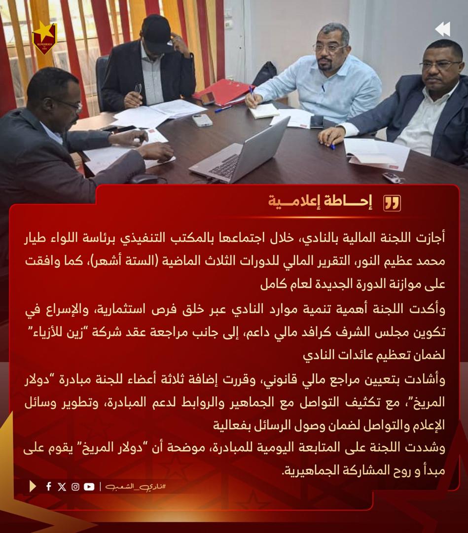 أجازت اللجنة المالية بنادي المريخ، خلال اجتماعها بالمكتب التنفيذي برئاسة اللواء طيار محمد عظيم النور التقرير المالي للدورات الثلاث الماضية (الستة أشهر)، كما وافقت على موازنة الدورة الجديدة لعام كامل وأكدت اللجنة أهمية تنمية موارد النادي عبر خلق فرص استثمارية، والإسراع في تكوين مجلس الشرف كرافد مالي داعم، إلى جانب مراجعة عقد شركة “زين للأزياء” لضمان تعظيم عائدات النادي وأشادت بتعيين مراجع مالي قانوني، وقررت إضافة ثلاثة أعضاء للجنة مبادرة “دولار المريخ”، مع تكثيف التواصل مع الجماهير والروابط لدعم المبادرة، وتطوير وسائل الإعلام والتواصل لضمان وصول الرسائل بفعالية وشددت اللجنة على المتابعة اليومية للمبادرة، موضحة أن دولار المريخ” يقوم على مبدأ و روح المشاركة الجماهيرية.