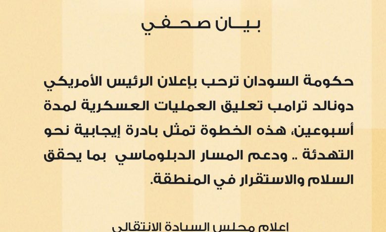 الخرطوم _ رحبت حكومة السودان بإعلان الرئيس الأمريكي دونالد ترامب القاضي بتعليق العمليات العسكرية لمدة أسبوعين، معتبرة الخطوة بادرة إيجابية نحو التهدئة.