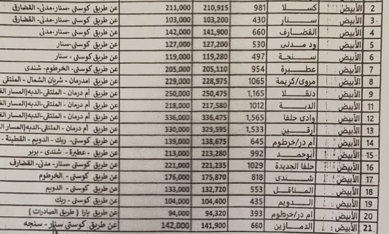 وفيما يلي قائمة بأبرز أسعار التذاكر الجديدة من مدينة الأبيض (شاملة ضريبة القيمة المضافة والدمغة):