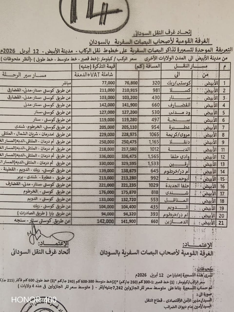 أعلن اتحاد غرف النقل السوداني والغرفة القومية لأصحاب البصات السفرية عن البدء في تطبيق التعريفة الموحدة الجديدة لتذاكر البصات السفرية المنطلقة من مدينة الأبيض إلى مختلف الولايات، وذلك اعتباراً من 12 أبريل 2026.