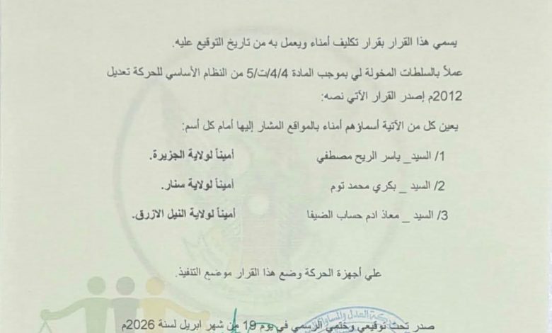 تعزيزا للهيكل التنظيمي ودفعا لانشطة الحركة في الولايات أصدر الدكتور جبريل إبراهيم محمد رئيس حركة العدل والمساواة السودانية القرارا رقم(6) للعام 2026 بتعيين امناء ولايات الجزيرة وسنار والنيل الأزرق.