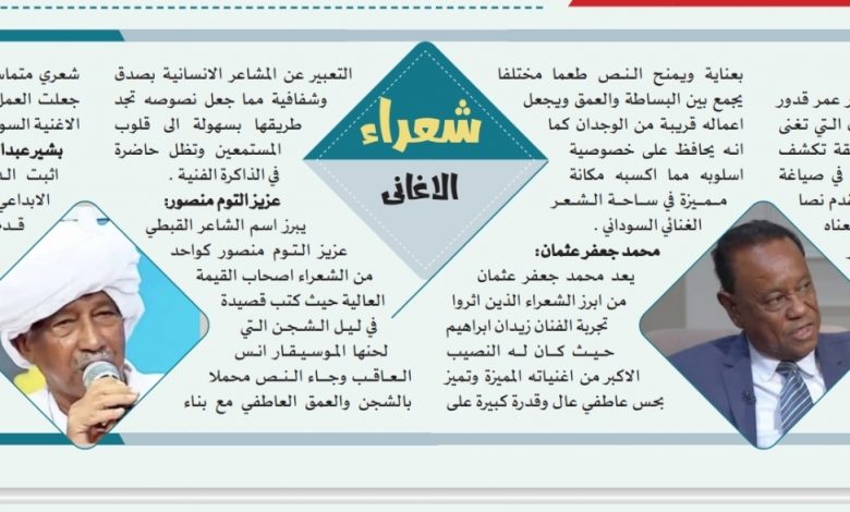 يبرز اسم الشاعر القبطي عزيز التوم منصور كواحد من الشعراء اصحاب القيمة العالية حيث كتب قصيدة في ليل الشجن التي لحنها الموسيقار انس العاقب وجاء النص محملا بالشجن والعمق العاطفي مع بناء شعري متماسك يعكس تجربة انسانية صادقة جعلت العمل واحدا من العلامات المضيئة في الاغنية السودانية .