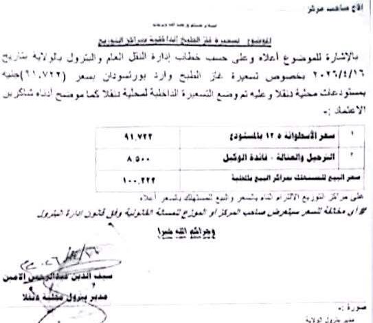 وبحسب تفاصيل الهيكل السعري الوارد في المستند، فقد تم تحديد سعر الأسطوانة من المستودع بمبلغ 91,722 جنيه، يُضاف إليها مبلغ 8,500 جنيه تغطي تكاليف الترحيل، العمالة، وهامش ربح الوكيل، ليصبح الإجمالي للمستهلك 100,222 جنيه.