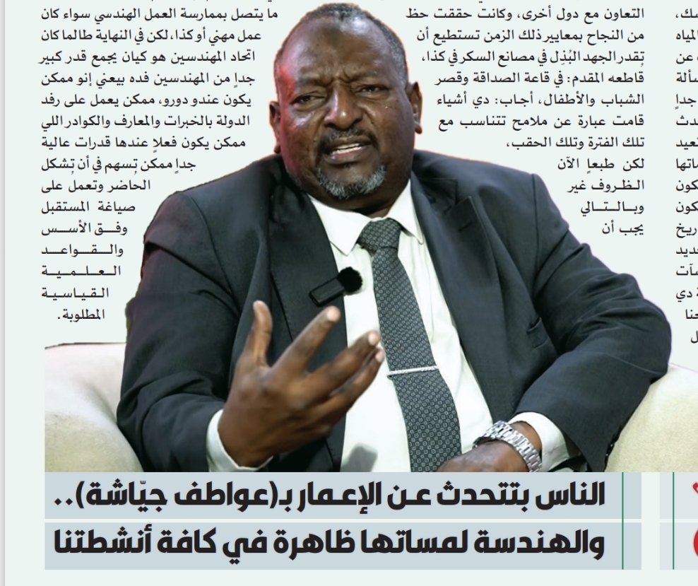 هو طبعاً المؤسسات والمنشآت ظهرت في حقب مختلفة وفي ظروف مختلفة، بالمناسبة في كثير من المؤسسات والمنشآت يعني لو دايرين نرجع للفترة بتاعة الراحل جعفر نميري عليه رحمة الله؛ في كثير جداً بالمناسبة من المشروعات وهي كانت قائمة على التعاون مع دول أخرى، وكانت حققت حظ من النجاح بمعايير ذلك الزمن تستطيع أن تُقدر الجهد البُذِل في مصانع السكر في كذا، قاطعه المقدم: في قاعة الصداقة وقصر الشباب والأطفال، أجاب: دي أشياء قامت عبارة عن ملامح تتناسب مع تلك الفترة وتلك الحقب، لكن طبعاً الآن الظروف غير وبالتالي يجب أن نتعامل بما توصل إليه الإنسان من إنسانية من علوم من تجارب خاصة وأنه السودانيين عندهم كسبهم وعندهم دورهم الكبير جداً جداً في المنطقة العربية ويمكن الناس ملَّت الإشارة لإنو السودانيين ساهموا في تطوير الحياة الهندسية في الدولة كذا والدولة كذا، فده حقيقة بيقود ويشير إلى إنو نحنا قادرين نعمل الأشياء بالمعايير المطلوبة، طبعا الإشارة لاتحاد المهندسين، اتحاد المهندسين طبعاً هو في النهاية كيان يعني حاجة أشبه بالنقابة، الكيان البيجمع المهندسين وهو يرعى شؤون الممتهنين المهنة يعني المهندسين سكنهم ظروف حياتهم علاجهم دي الشواغل الأساسية للاتحاد ولكن الممتهنين أو المهندسين كممتهنين ومنضويين تحت لواء الاتحاد هم كذلك ممكن يكون في فرصة لإكسابهم المزيد من المعارف والخبرات عبر التدريب عبر اتاحة فرص للدراسات في مستويات أعلى، وهُم في النهاية فصيل مهم جداً لأنو هم عبارة عن كيان بيجمع مجموعة كبيرة جداً جداً، هو الكيان الأشمال البجمع مجموعة كبيرة جداً جداً من المهندسين على صعيد واحد، صحيح هو ليس بالمؤسسة الوحيدة لأنو المؤسسة الحكومية في البنية الهيكلية بتاعة الدولة عن إدارة أو مراعاة القيام بدور الحاكمية في ما يتصل بالعمل الهندسي هو المجلس الهندسي، يعني المجلس الهندسي كيان آخر حقيقة أنا أتشرف بعضوية المجلس الهندسي السوداني، هو ده الكيان اللي بمثل الدولة وبالتالي هو مهموم بإنو يقوم بدور الحاكمية بكل ما يتصل بممارسة العمل الهندسي سواء كان عمل مهني أو كذا، لكن في النهاية طالما كان اتحاد المهندسين هو كيان يجمع قدر كبير جداً من المهندسين فده بيعني إنو ممكن يكون عندو دورو، ممكن يعمل على رفد الدولة بالخبرات والمعارف والكوادر اللي ممكن يكون فعلاً عندها قدرات عالية جداً ممكن تُسهم في أن تُشكل الحاضر وتعمل على صياغة المستقبل وفق الأسس والقواعد العلمية القياسية المطلوبة.