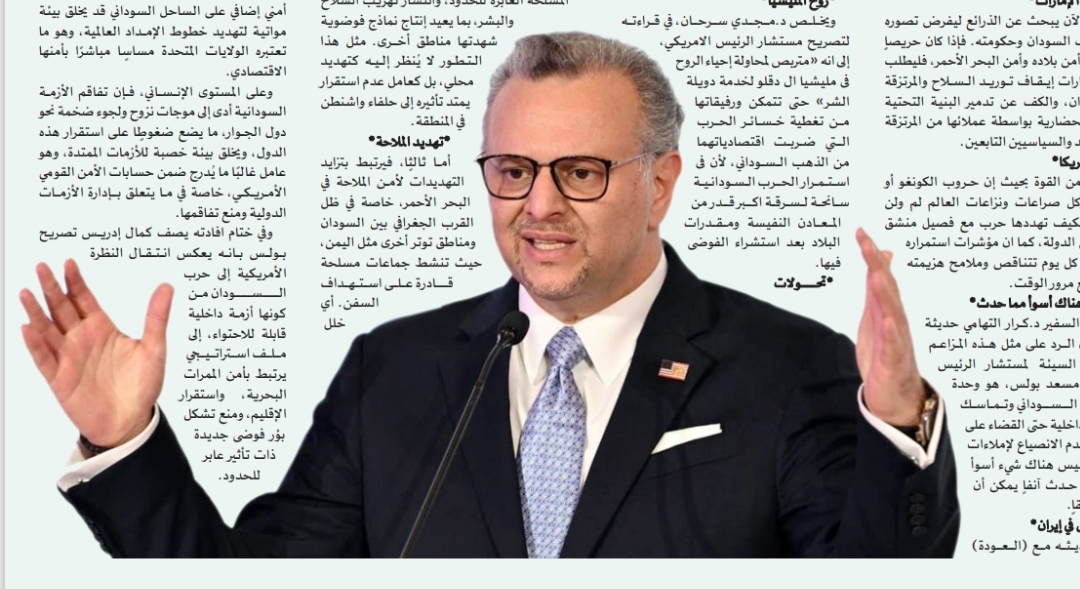 وفي ختام افادته يصف كمال إدريس تصريح بولس بانه يعكس انتقال النظرة الأمريكية إلى حرب السودان من كونها أزمة داخلية قابلة للاحتواء، إلى ملف استراتيجي يرتبط بأمن الممرات البحرية، واستقرار الإقليم، ومنع تشكل بؤر فوضى جديدة ذات تأثير عابر للحدود.