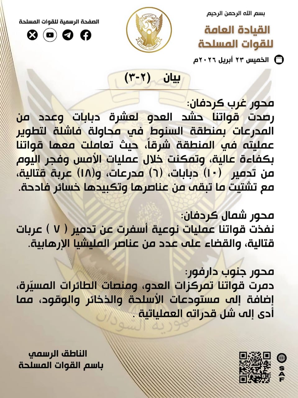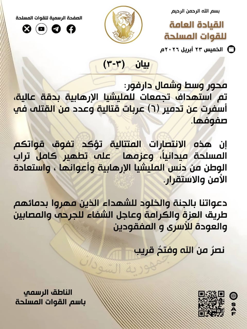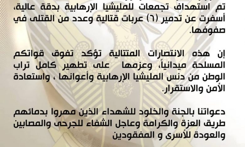 ​واختتمت القوات المسلحة بيانها بالتأكيد على أن هذه الانتصارات الميدانية المتلاحقة تعزز من عزمها على تطهير كافة أراضي الوطن واستعادة الأمن والاستقرار، ترحماً على الشهداء وتمنياتها بالشفاء للجرحى والعودة للمفقودين.