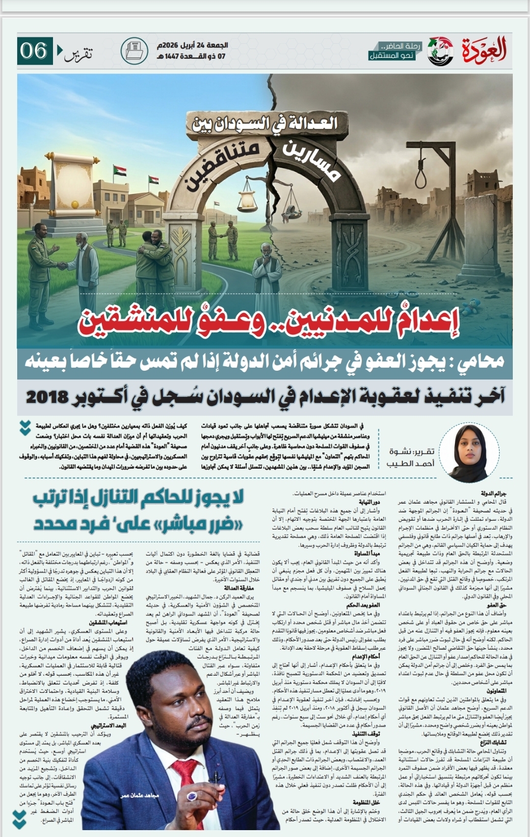 وفي ما يتعلق بأحكام الإعدام، أشار إلى أنها تحتاج إلى تصديق وتعضيد من المحكمة الدستورية لتصبح نافذة، لافتًا إلى أن السودان لا يملك محكمة دستورية منذ أبريل 2019، وهو ما أدى عمليًا إلى تعطل مسار تنفيذ هذه الأحكام.