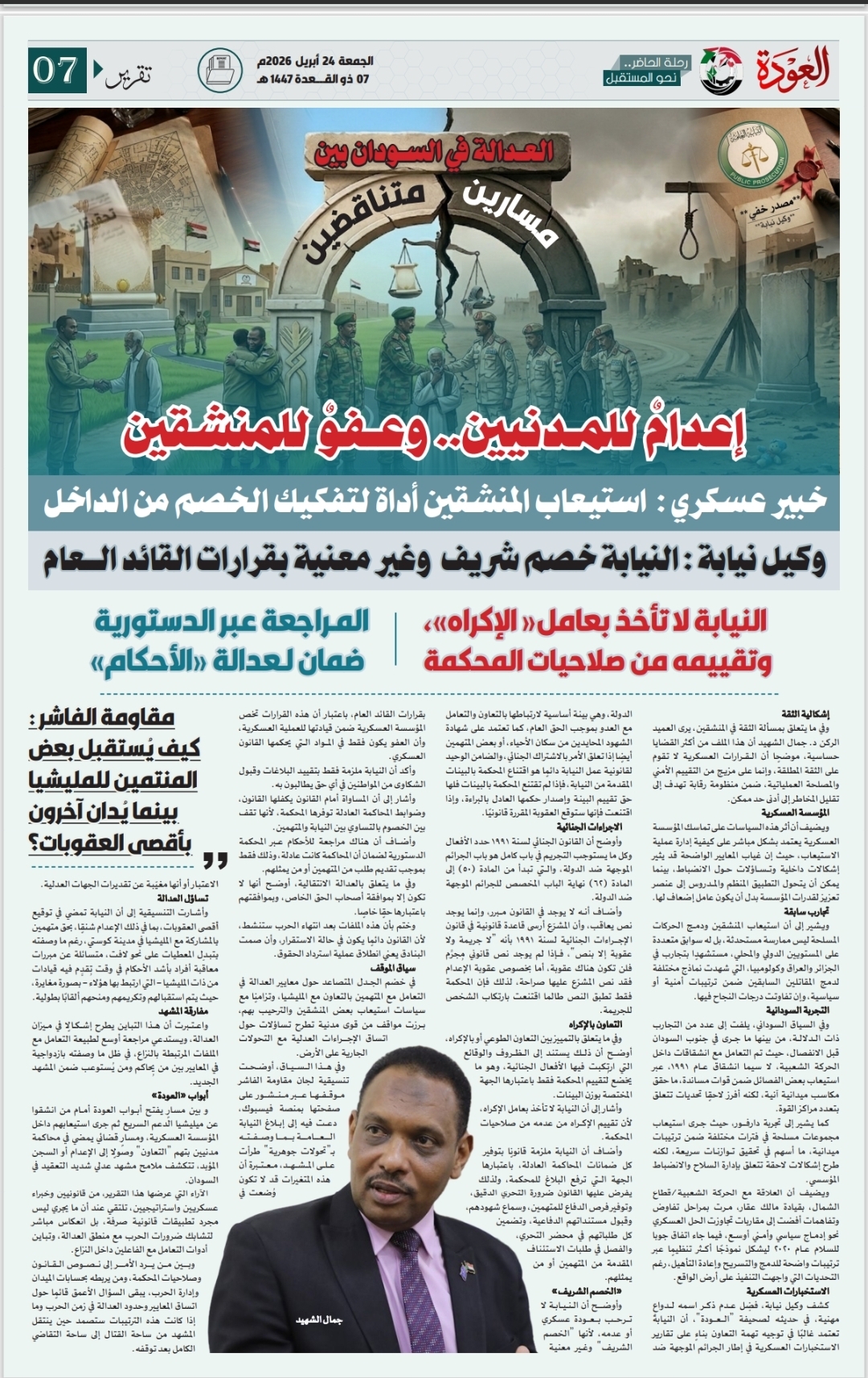 يرى العميد الركن د. جمال الشهيد، الخبير الاستراتيجي المتخصص في الشؤون الأمنية والعسكرية، في حديثه لصحيفة “العودة”، أن المشهد السوداني الراهن لم يعد يُختزل في كونه مواجهة عسكرية تقليدية، بل أصبح حالة مركبة تتداخل فيها الأبعاد الأمنية والقانونية والاستراتيجية، الأمر الذي يفرض تساؤلات عميقة حول كيفية تعامل الدولة مع الفئات المرتبطة بالنزاع بدرجات متفاوتة، سواء عبر القتال المباشر أو عبر أشكال الدعم والارتباط غير المباشر.