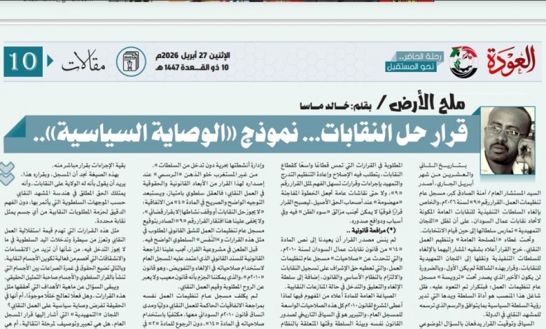 لم ينسَ مصدر القرار أن يعيدنا إلى نص المادة “14” من قانون نقابات عمال السودان لسنة 2010م، والتي تتحدث عن “صلاحيات” مسجل عام تنظيمات العمل، والتي تعطيه حق الإشراف على تسجيل النقابات والالتزام بالنظام الأساسي والقانون، إضافة إلى سلطة الإلغاء والتعليق والتدخل في حالة المنازعات النقابية.