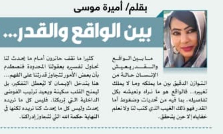 الواقع يُحمّلنا مسؤولية السعي والعمل واتخاذ القرار بينما القدر يذكرنا أن النتائج ليست بأيدينا وحدنا. هذه المعادلة ليست تناقضًا، بل تكامل فالحياة لا تُبنى بالتواكل ولا تُحتمل بالإنكار.. نحن مطالبون بأن نبذل أقصى ما نستطيع ثم نُسلّم بما يأتي راضين لا مستسلمين مؤمنين لا عاجزين.