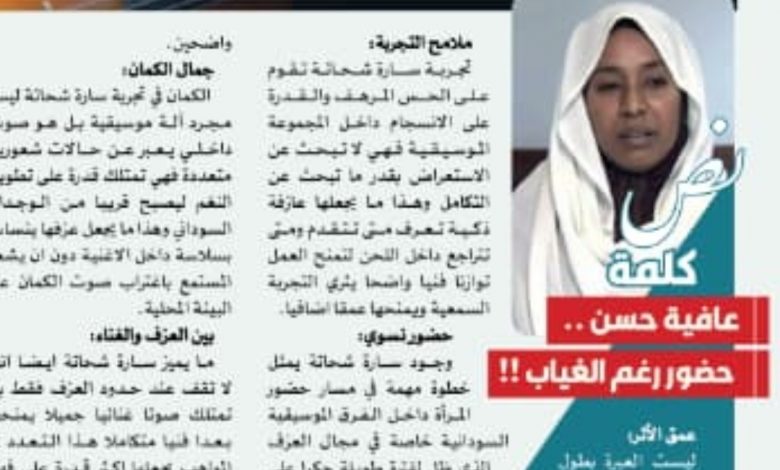 ليست العبرة بطول الإقامة في ساحة الغناء بل بقدرة الفنان على ترك بصمة حقيقية تبقى في الوجدان عافية حسن قدمت نفسها كصوت مختلف يحمل إحساسا عاليا وحضورا لافتا عبر مشاركاتها في أغاني وأغاني فاستطاعت خلال فترة قصيرة أن تفرض اسمها وتؤكد موهبتها بشكل واضح وقوي.