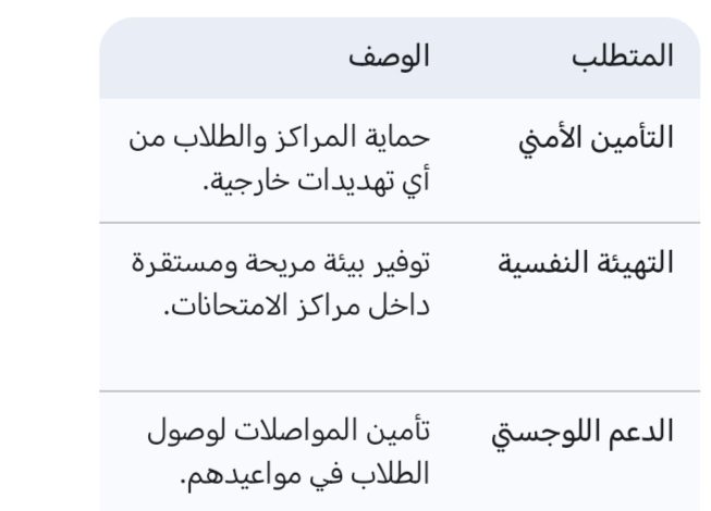 والتهيئة النفسية: إعداد مراكز الامتحانات ببيئة مريحة تساعد الطلاب على الأداء بروح مستقرة، بجانب الدعم اللوجستي: توفير سبل المواصلات لضمان وصول الطلاب في المواعيد المحددة، وتوفير الخدمات الطبية العاجلة لأي ظرف طارئ.