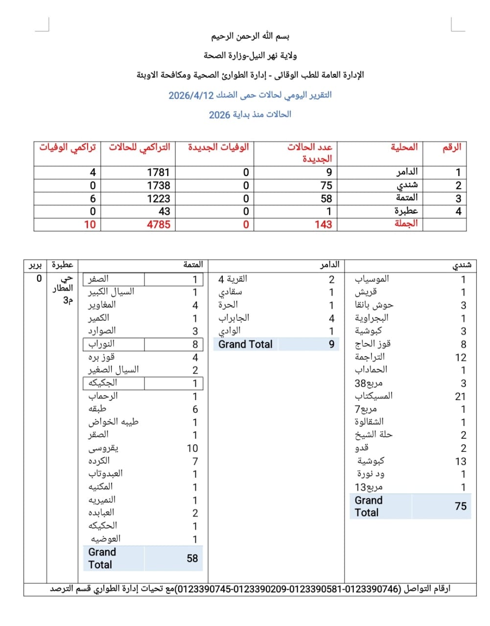 ​أعلنت وزارة الصحة بولاية نهر النيل، عبر الإدارة العامة للطب الوقائي (إدارة الطوارئ الصحية ومكافحة الأوبئة)، عن تسجيل (143) حالة إصابة جديدة بحمى الضنك، وفقاً للتقرير اليومي الصادر بتاريخ 12 أبريل 2026.