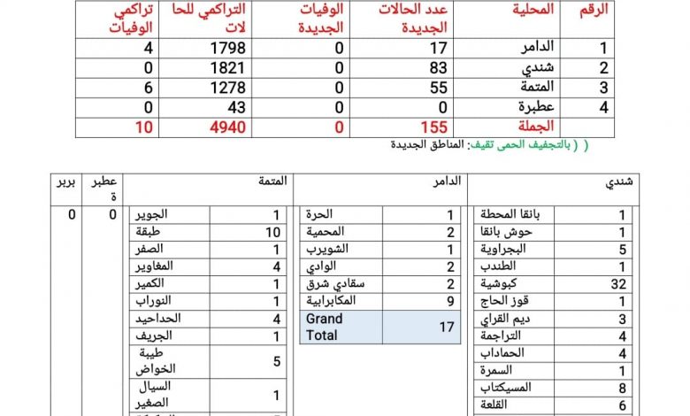 تصدرت محلية شندي قائمة الإصابات الجديدة، تلتها محليتا المتمة والدامر، وجاء التوزيع على النحو التالي: