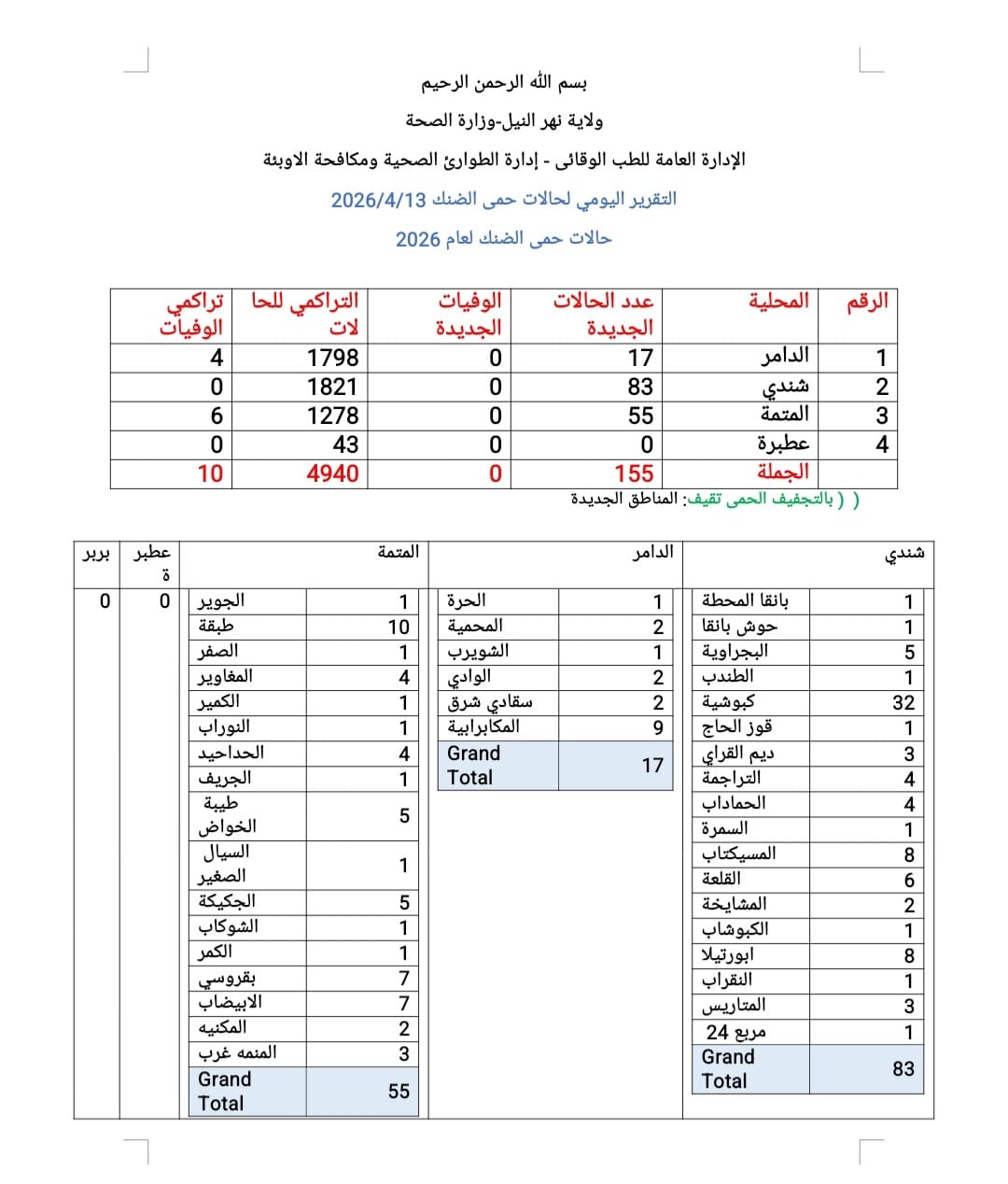 محلية شندي: سجلت 83 حالة جديدة، حيث تركزت أعلى الإصابات في منطقة “كبوشية” بـ 32 حالة.