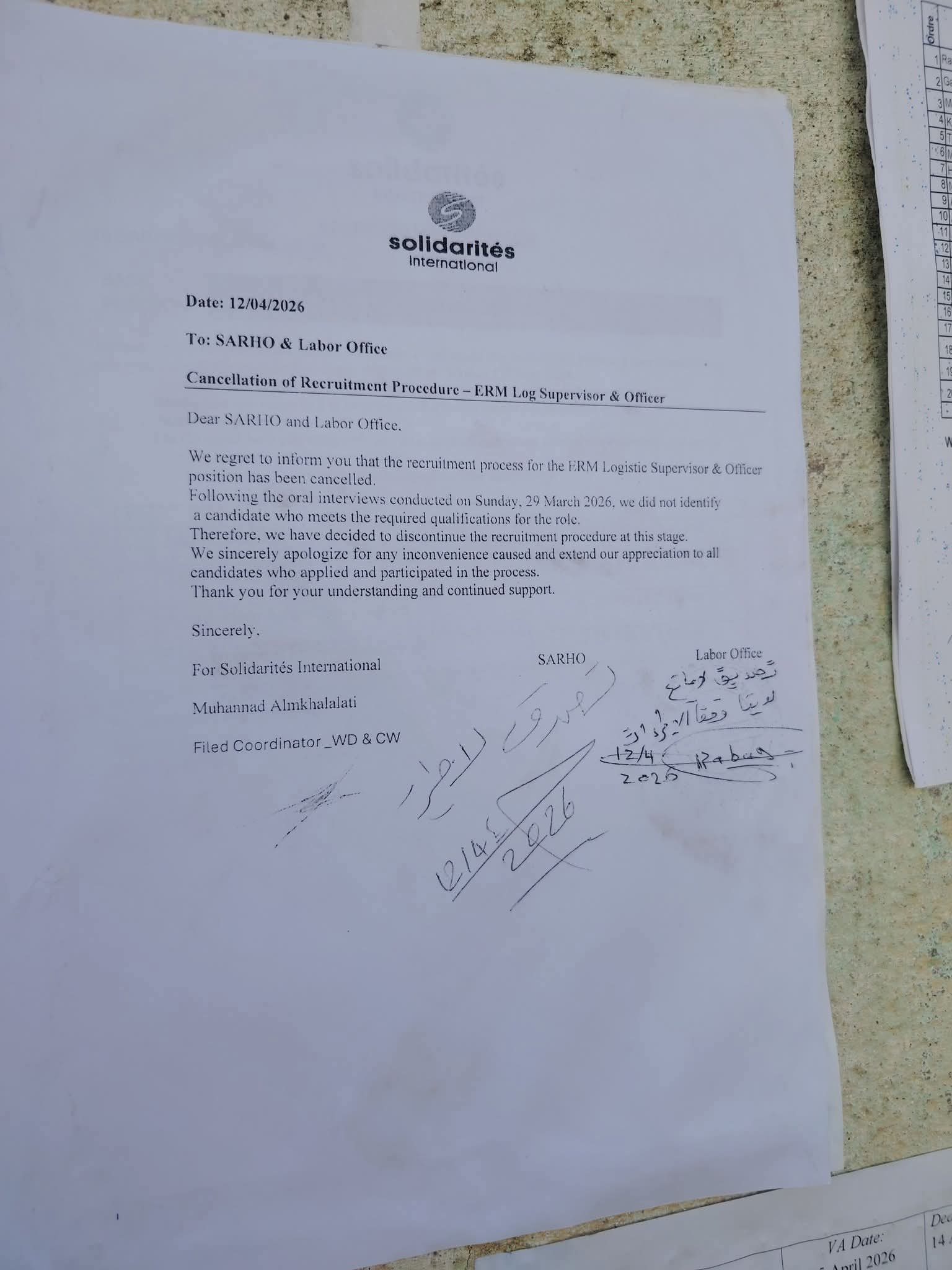 وكشفت وثيقة رسمية حصلت عليها صحيفة “العودة”، وموجهة إلى مكتب العمل ومنظمة “سارحو”، أن المنظمة قررت إيقاف إجراءات التوظيف لمنصبي (مشرف وضابط لوجستيات ERM)، وذلك في أعقاب المعاينات التي أجريت في التاسع والعشرين من مارس الماضي.